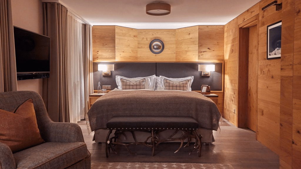 Das The Capra zählt zu den modernsten alpinen Hideaways der Schweiz: Mit nur 38 Suiten bietet es eine persönliche und zugleich luxuriöse Atmosphäre. Inspiriert von regionaler Architektur und Materialien, setzt das Design auf warme Holz- und Steinelemente, grosse Fensterflächen und ruhige Erdtöne, die die umliegende Natur widerspiegeln. Jede Suite verfügt über einen separaten Wohnbereich, einen Balkon oder eine Terrasse mit Panoramablick auf die Gletscherberge.