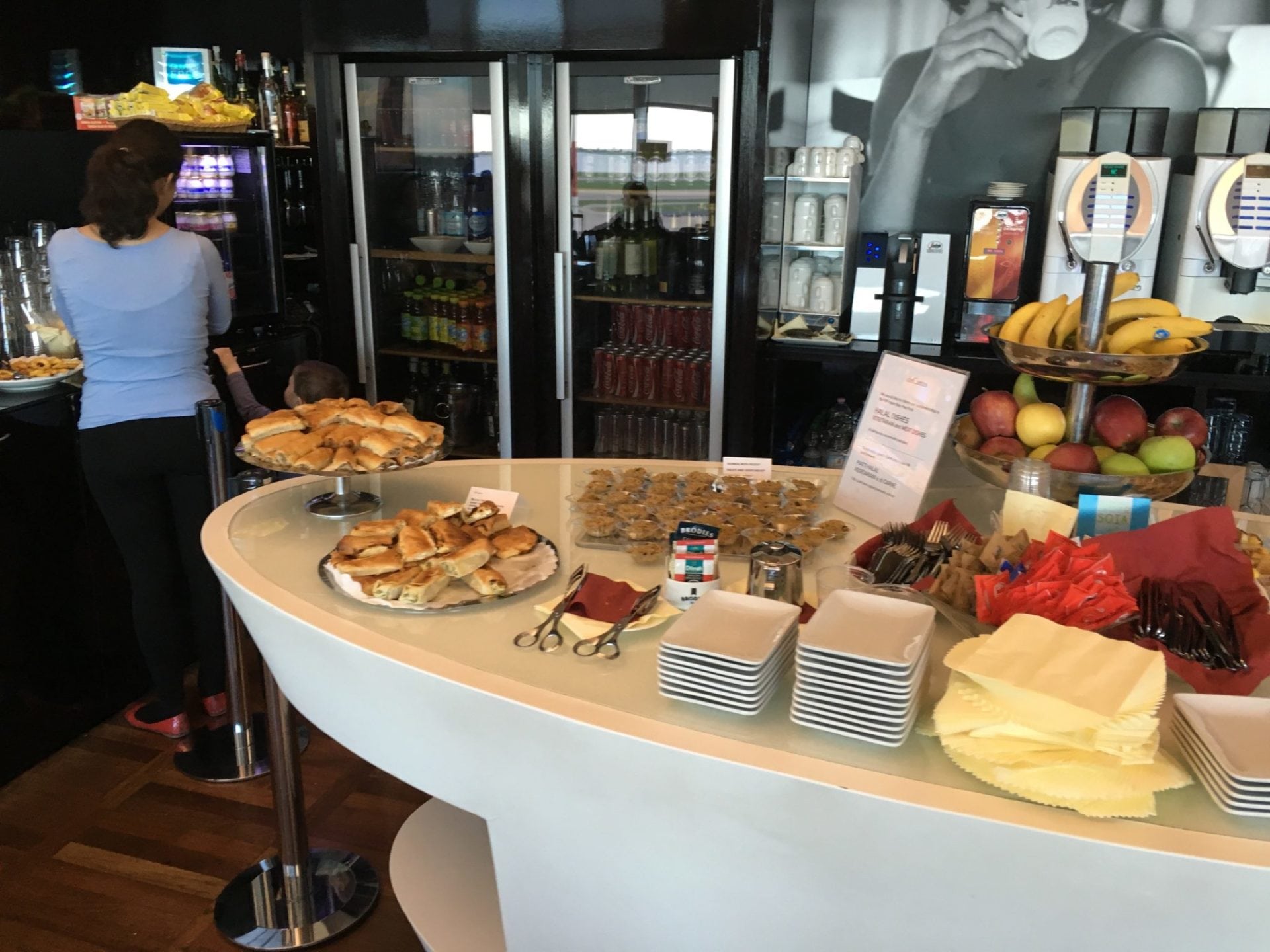 Auf der Buffetinsel werden eine Auswahl an Sandwich, Pizza, kleinen Salaten sowie süssen Teilchen, Kuchen und Obst angeboten. Interessant fand ich den stellenweise leichten orientalischen Einschlag, der bei einer Vielzahl an arabischen Gästen sicherlich sinnvoll ist.
