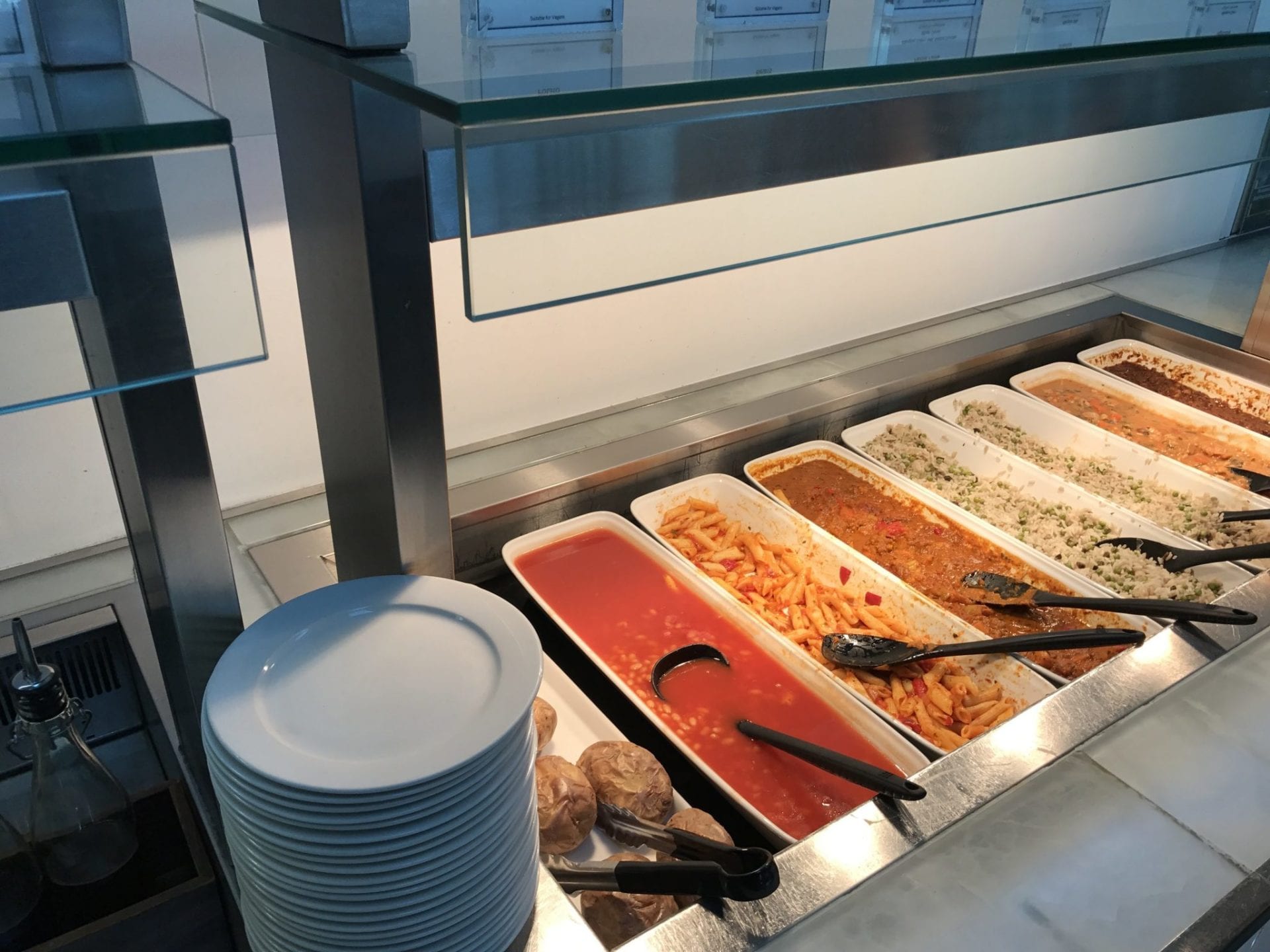 Auf der rechten Seite der Lounge gibt es ein Buffet mit diversen Salaten und warmen Speisen je nach Uhrzeit. Bei meinem Besuch kurz nach 12 Uhr gab es noch Croissants und Obst vom Frühstück sowie ein Angebot an Mittagessen. Eine Bar mit Spirituosen und Softdrinks gibt es ebenso.