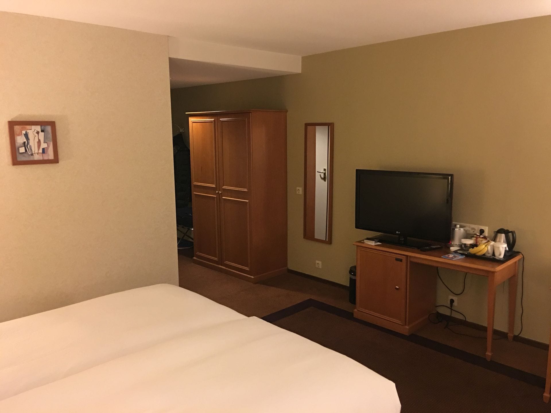 Die Betten sind sehr gut, es gibt einen grossen Schreibtisch, einen Flachbildschirm mit vielen deutschen Sendern, an dem man aber leider nicht seine eigenen Geräte anschliessen kann. Auch einen Wasserkocher mit einer Auswahl an Tee und Kaffee gibt es. Ein kleines Willkommensgeschenk gab es zudem auch.