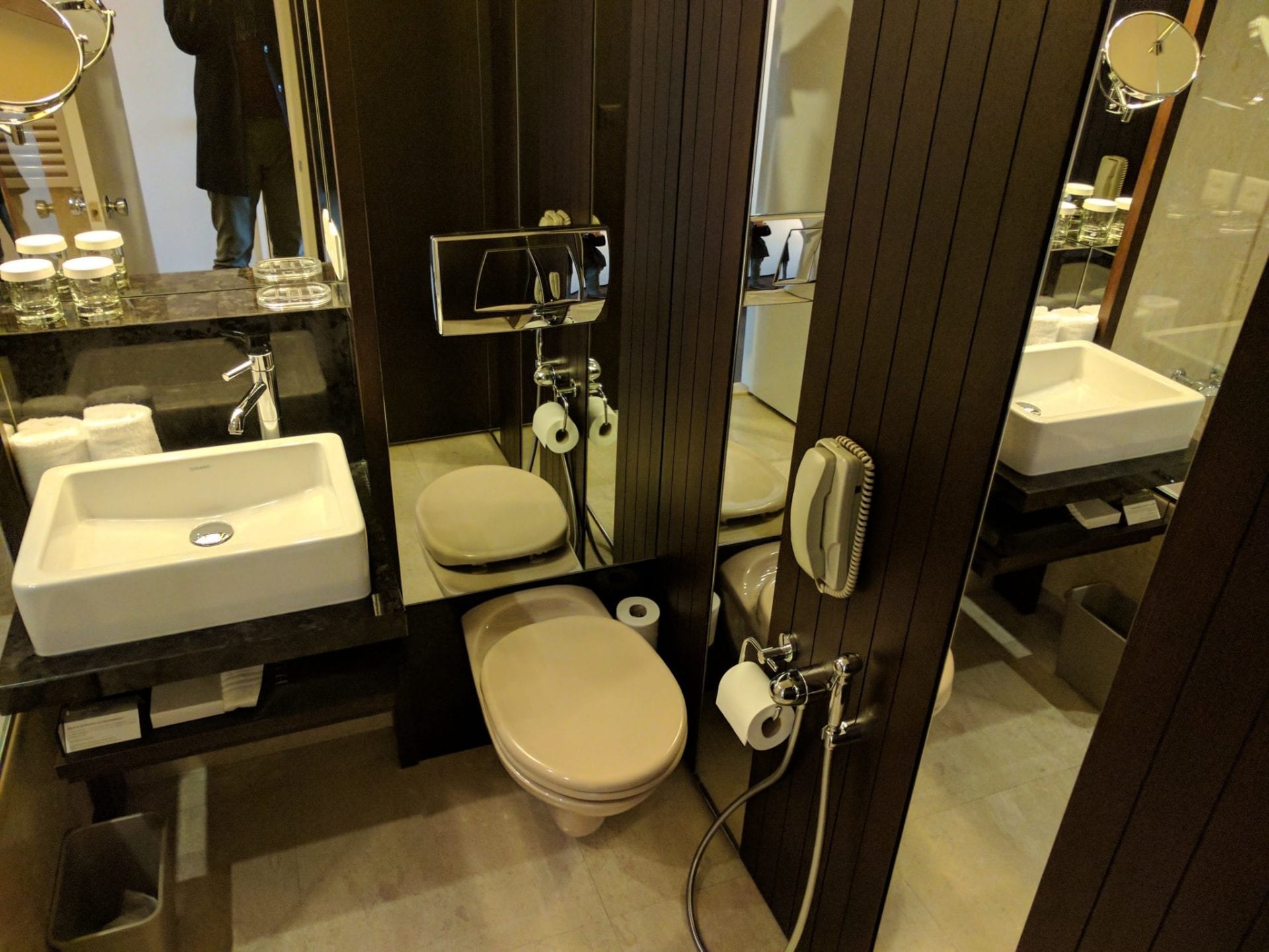 Mit 35 Quadratmetern ist das Zimmer zwar in der Theorie relativ gross, allerdings geht durch den Verbindungsgang ins Nebenzimmer viel Platz verloren. Dieser ist im Badezimmer dagegen bitter nötig, besonders die Positionierung der Toilette ist ziemlich unglücklich. Das einzelne Waschbecken hatte ausserdem nur begrenzte Ablagemöglichkeiten.
