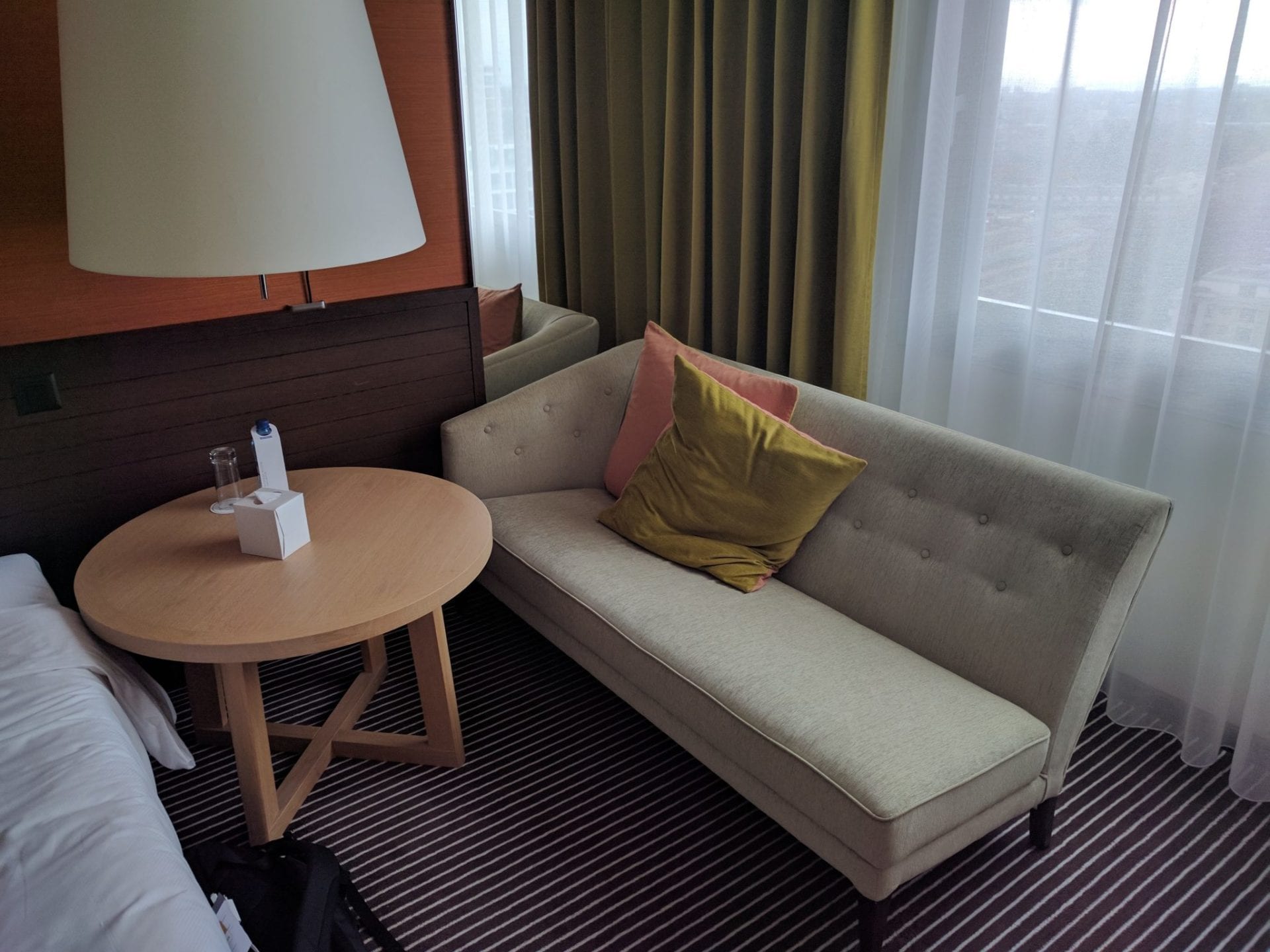 Ausgestattet ist das Zimmer klassisch mit zwei Betten, einem kleinen Schreibtisch, diversen Schränken und einer kleinen Couch. Wirklich überzeugt war ich von der Einrichtung allerdings nicht. Der Schreibtisch war zu klein, um ernsthaft zu arbeiten, dazu wurde beim Stuhl mehr Wert aufs Design als Ergonomie gelegt. Mit dem Mobiliar konnte ich mich insgesamt nicht wirklich anfreunden, aber dies ist sicherlich auch Geschmackssache. Der Fernseher war ungewohnt klein, aber auch kein Reinfall. Nett waren neben der Nespresso Maschine auch die diversen Bücher auf Englisch und Französisch, die im Zimmer verteilt waren.