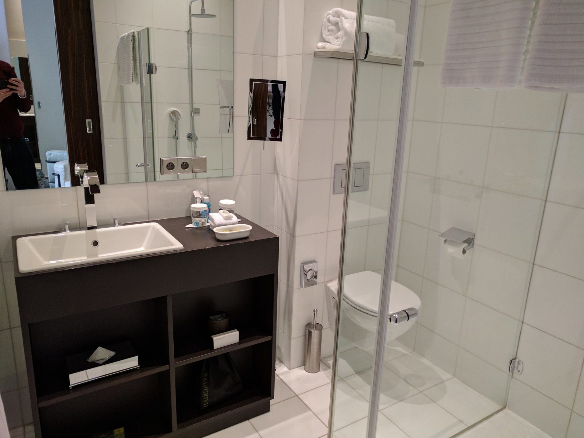 Generell begeisterte mich am Zimmer vor allem die hohe Deckenhöhe, die ich auf über vier Meter schätzen würde. Kein Hotelzimmer, in dem ich bereits zu Gast sein durfte, verfügte über solch hohe Decken. Schwachpunkt dieses Zimmers war, wie so oft, das Badezimmer. Hier fehlte es schlicht und ergreifend um Platz. Eine Badewanne sucht man ebenso vergeblich wie ein zweites Waschbecken. Während die Regendusche sehr geräumig ist, fehlt der Platz bei der Toilette. Unschön sind zudem die Abnutzungsspuren am Waschtisch.