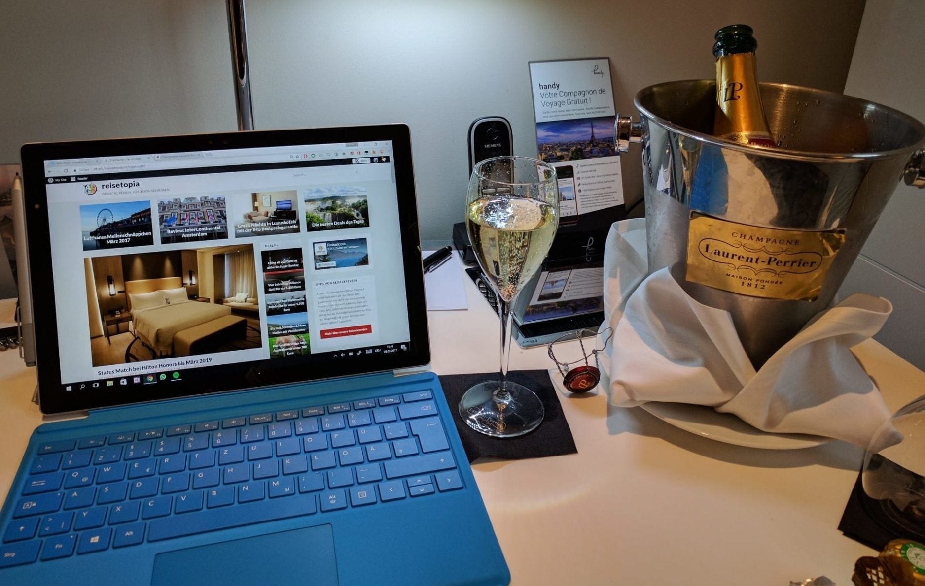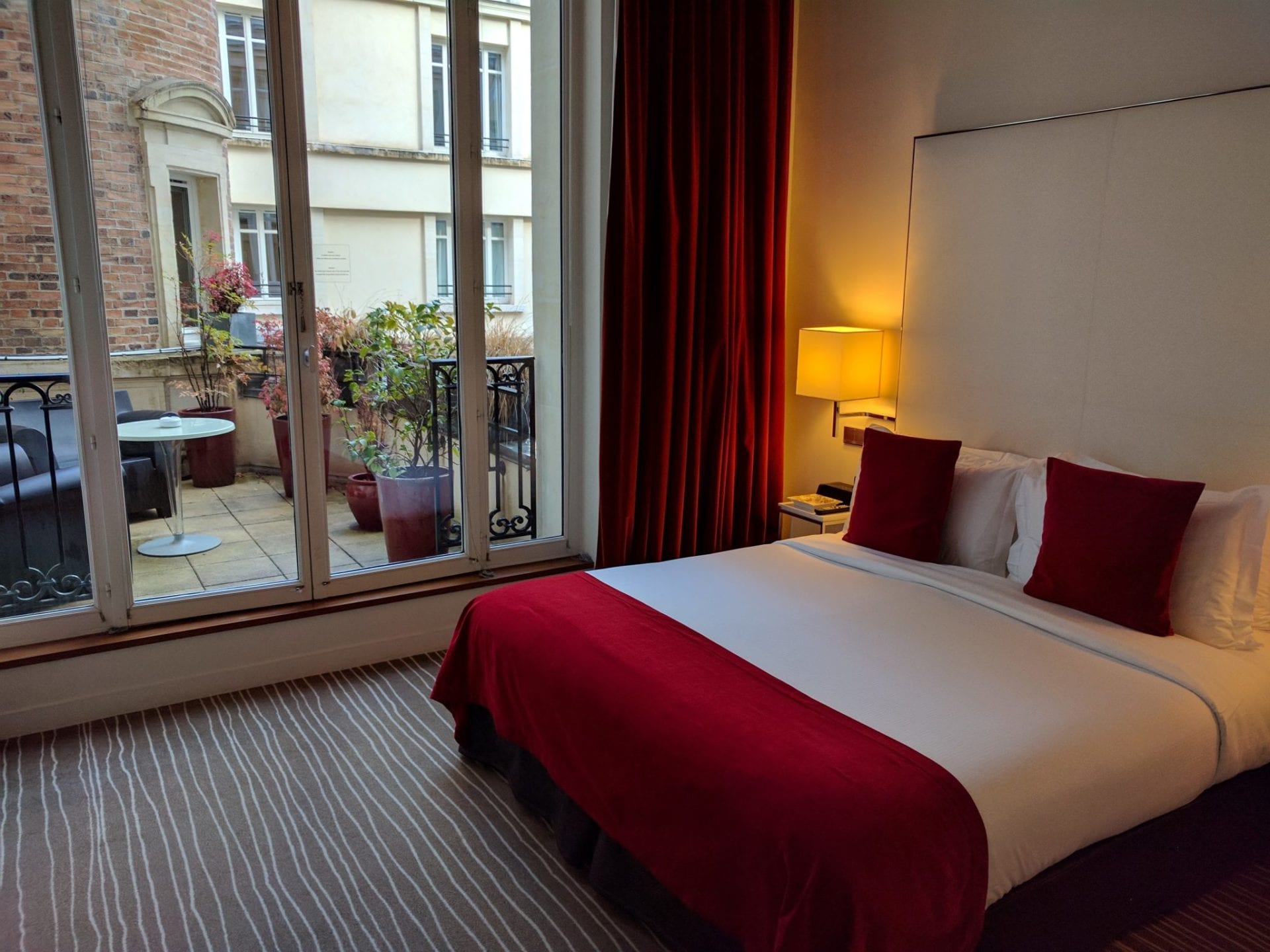 Gebucht hatte ich ursprünglich die Suite im obersten Stockwerk mit Blick auf Paris. Der vorherige Gast hatte allerdings gesundheitliche Probleme und um eine Verlängerung seines Aufenthalts geben, wie mir der General Manager beim Check-in erklärte. Daher wurde ich in einem King Premier Room mit Terrasse untergebracht. Beide Zimmer kosten zwar dasselbe, allerdings hatte ich aufgrund des Ausblicks bewusst die Suite gebucht. Angesichts der Umstände und der Tatsache, dass das Hotel nur eine Suite dieses Typs hat, konnte ich mich aber mit dem King Premier Room anfreunden. Weiterhin wurde mir das Frühstück als Entschädigung kostenfrei angeboten. Zudem brachte man eine Flasche Champagner vorbei und gewährte sämtliche Ambassador Benefits.