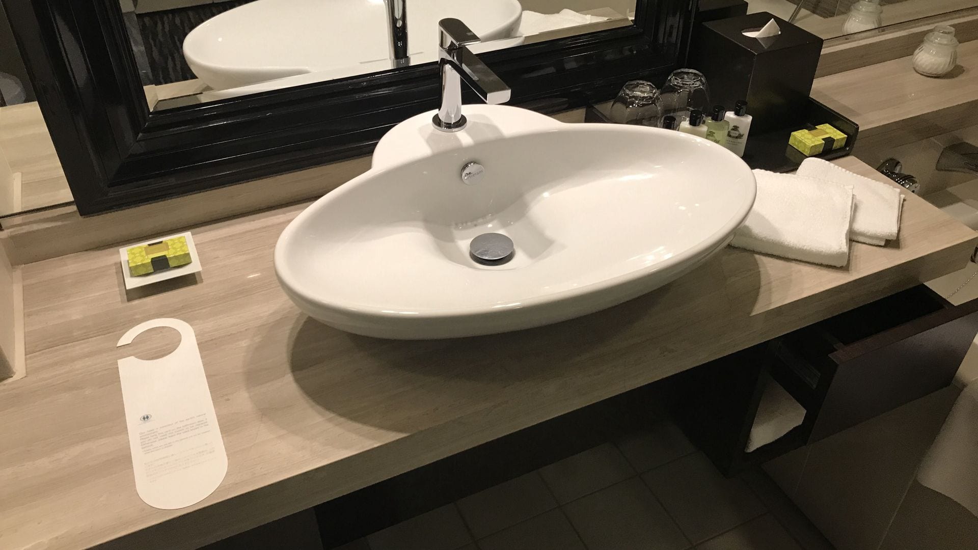 Das Badezimmer befindet sich linkkseitig vom Eingang des Zimmers und ist ebenfalls sehr grosszügig und schick gestaltet. Es gibt eine grosse Walk-in Dusche und eine Badewanne. Die japanische Toilette mit allerlei High-Tech darf natürlich genau so wenig wie das grosse Waschbecken fehlen.