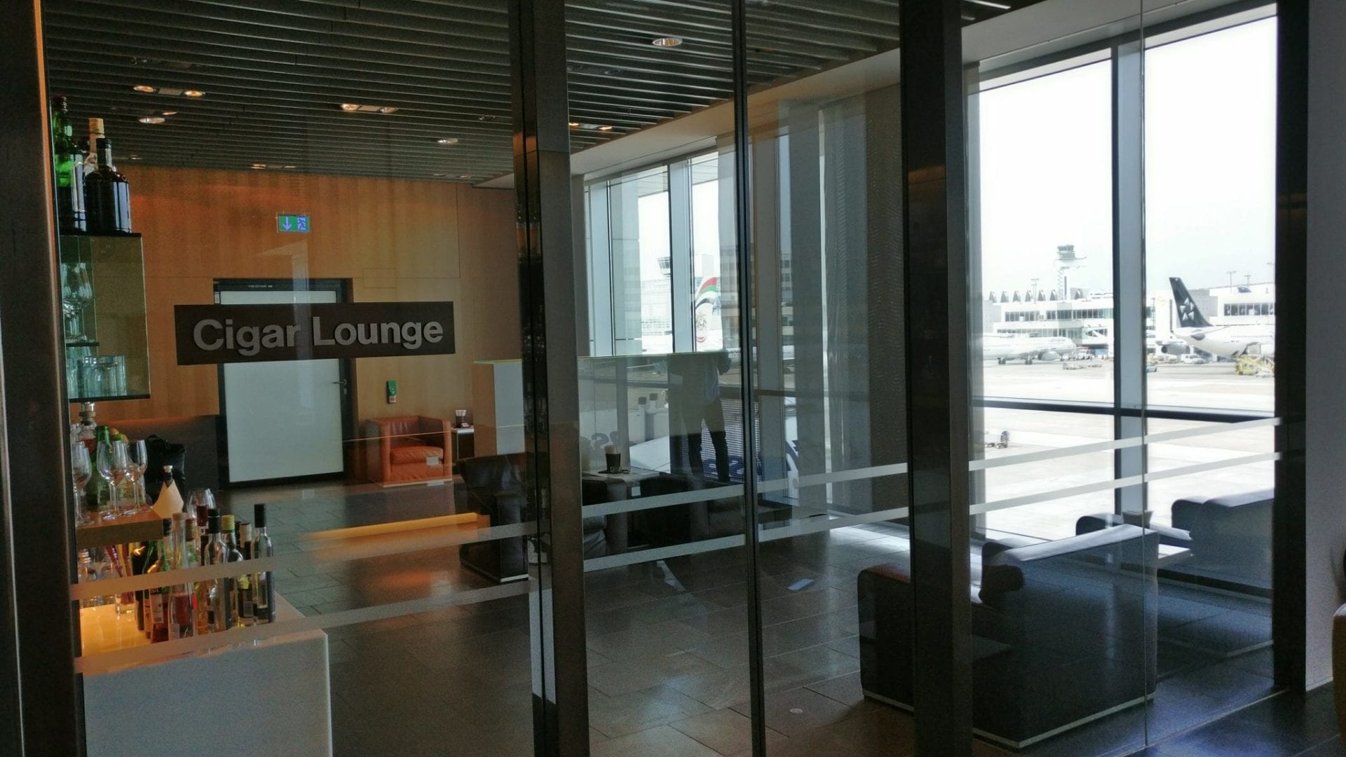 Darüber hinaus ist, wie in jeder Lufthansa First Class Lounge, eine Zigarren-Lounge zu finden, in der neben einer umfassenden Auswahl an Tabakprodukten auch Getränke angeboten werden. Dabei ist der Raum klimatisiert, sodass der Geruch nach Tabak zwar zu bemerken ist, allerdings nicht penetrant oder störend ist.