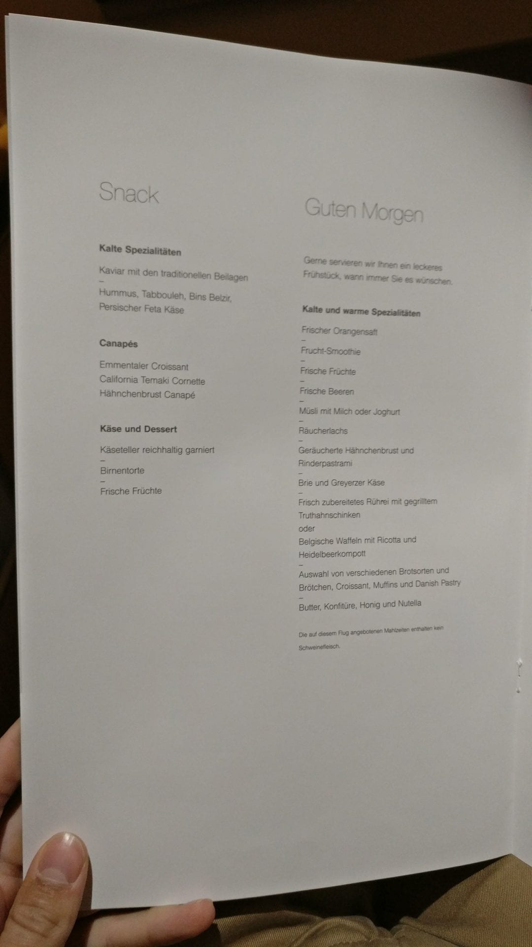 Kurz nach dem Start wurde noch ein kurzer Snack serviert, ich entschied mich durch die späte Uhrzeit und mein Abendessen in der Senator Lounge allerdings gegen ein zusätzliches Essen. Angeboten wurden Canapés, arabische Mezze und der typische Lufthansa First Class Kaviar-Service.