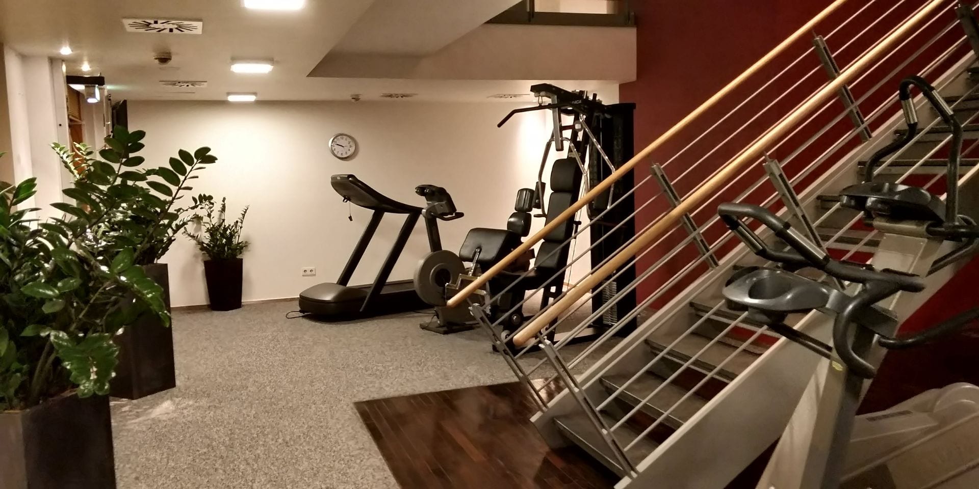 Eine Ebene tiefer gibt es den Fitnessraum mit einigen Cardiogeräten und auch Einzelhanteln.
