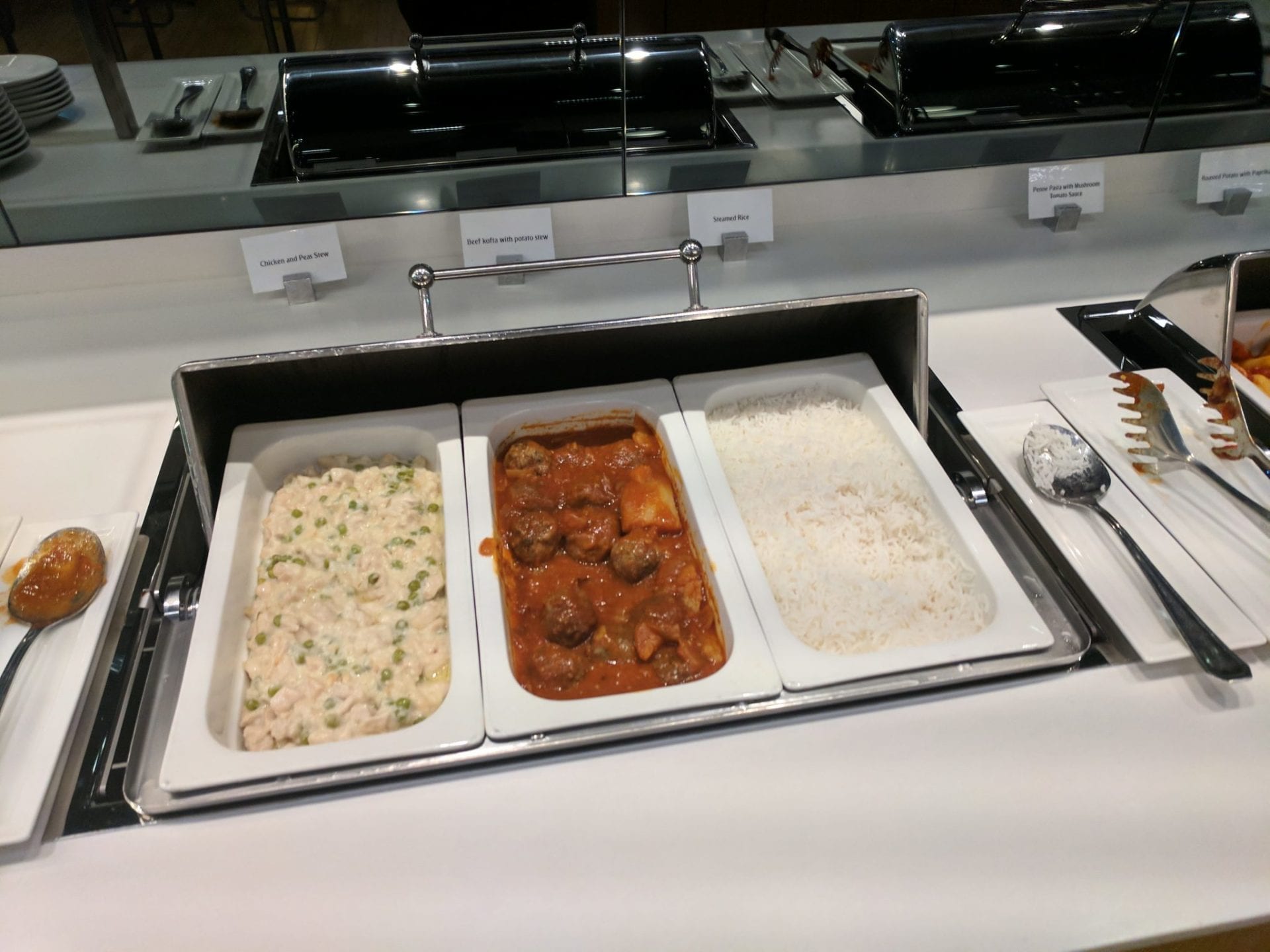 Für eine Senator Lounge bietet die Lounge in Dubai eine überdurchschnittliche Auswahl an Speisen. Während meines Aufenthaltes am Abend bot man beispielsweise vier warme Gerichte, zwei Suppen und diverse Brote, Vorspeisen und zwei Nachspeisen.