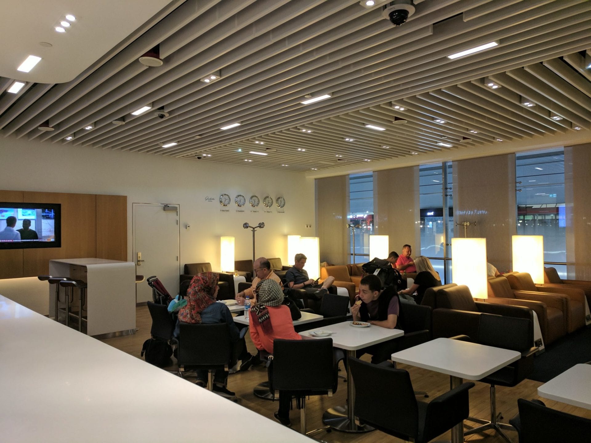 Die Fenster bieten leider nur den Blick ins Flughafenterminal. Einen Vorfeldblick gibt es nicht. Da gegen Abend allerdings Air Canada, Lufthansa und Swiss recht nah hintereinander aus Dubai starten, könnte es durchaus etwas voller werden.