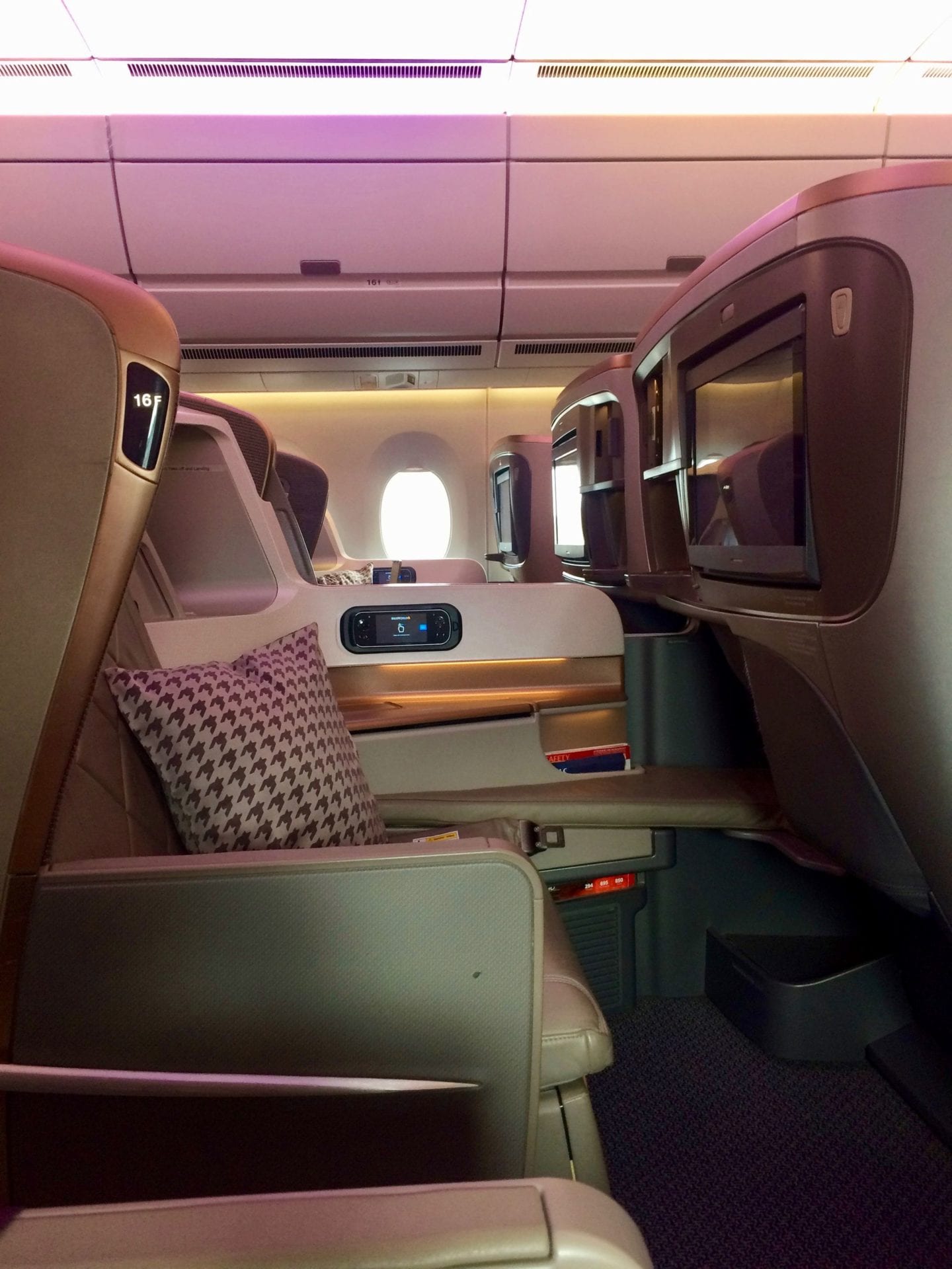 Der Singapore Airlines wird nachgesagt, dass die Kabine durch eine zu “enge” Bestuhlung und ein “zustellen” an Atmosphäre verliere. Dies kann ich nicht nachvollziehen. Die Sitze sind zwar etwas näher aneinander geordnet als bei manch anderen Airlines, durch das spezielle Design empfand ich meinen Platz jedoch als ausserordentlich privat, gemütlich und ruhig.
