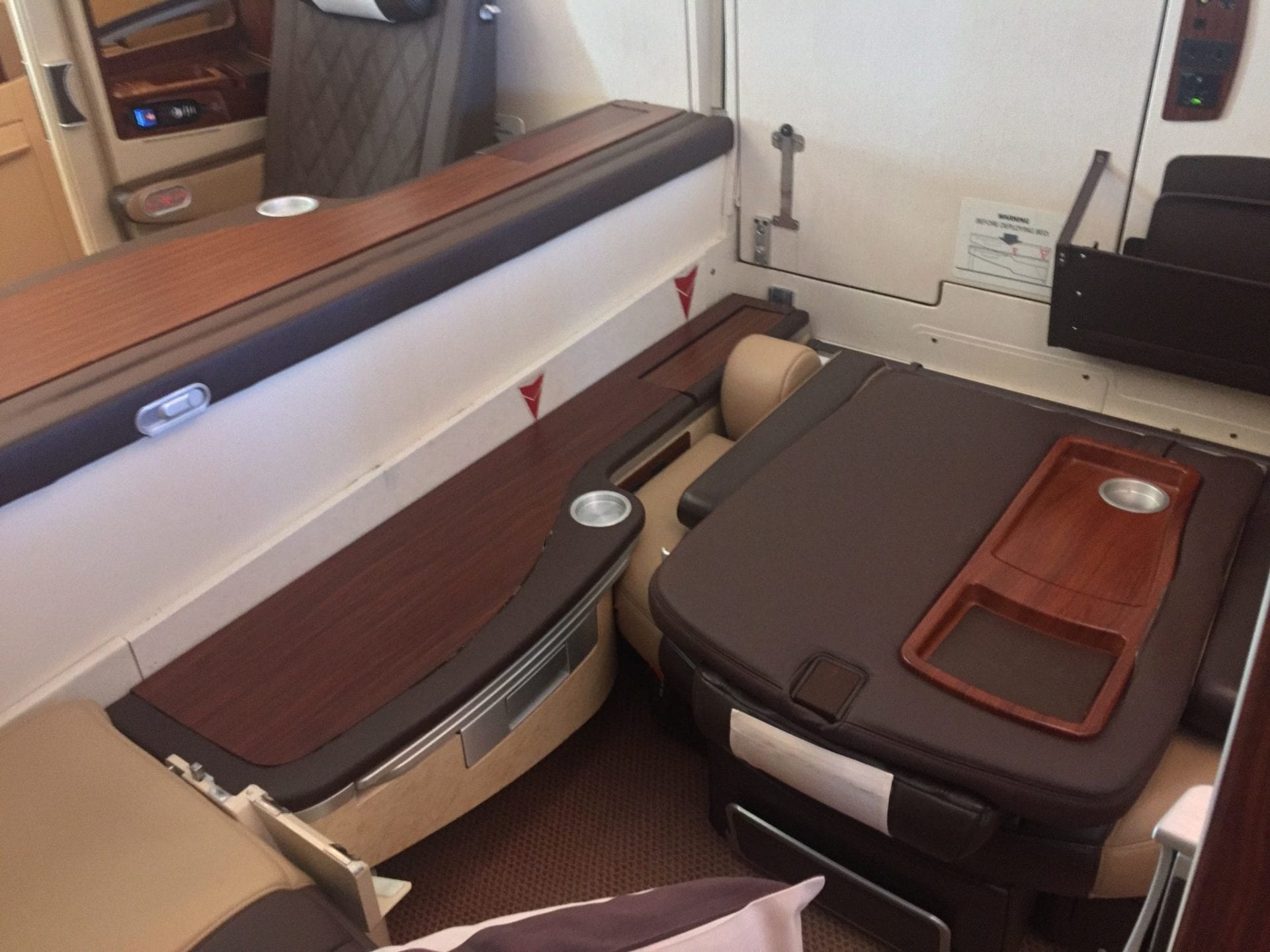 Der Tisch in der Singapore Airlines Suites Class fährt aus der Ablage heraus und ist zweistufig ausklappbar. Dabei bietet der Tisch eine enorme Ablagefläche und ist ebenso wie der Rest der Suite aus dunklem Holz verarbeitet. Der Sitz selber kann zwar bis zu einem gewissen Grad elektrisch herunter gefahren werden, um ein etwas entspannteres Sitzen zu ermöglichen, das flache Bett wird jedoch erst durch das Umklappen der gesamten Rückenlehne erreicht.