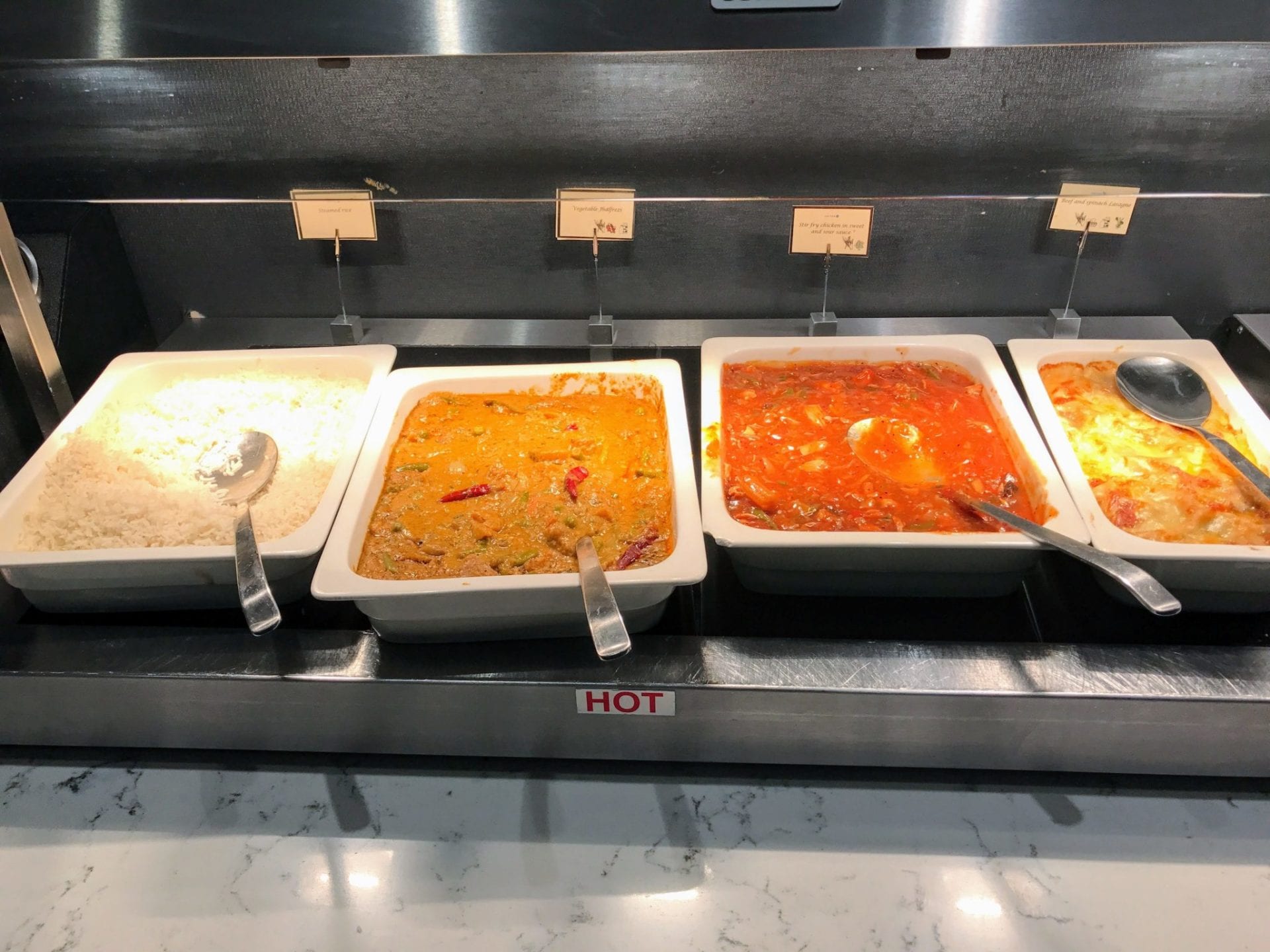 Ein grosszügiges Buffet mit diversen Snacks, Obst, Speisen, Sandwiche sowie Desserts findet Ihr in der Nähe des Eingangsbereiches des United Club London Heathrow. Bei meinem Besuch am späten Nachmittag konnte ich zwischen verschiedenen warmen Speisen auswählen.